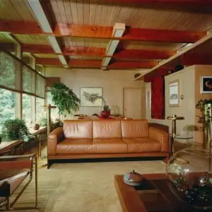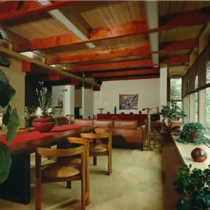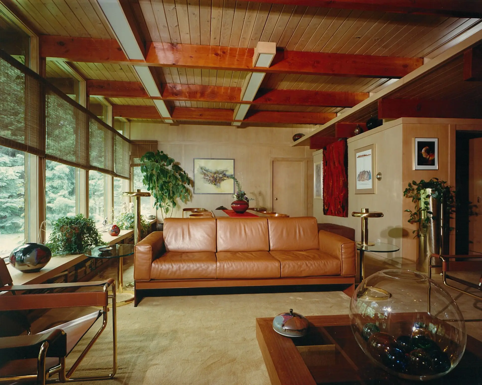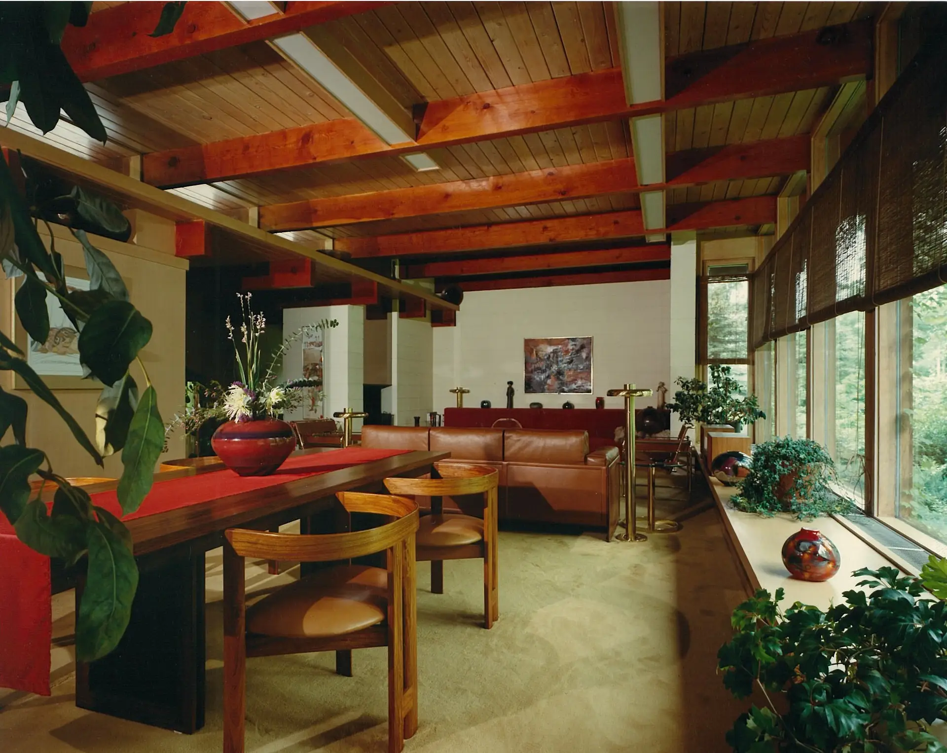 Upon entering the residence, one is drawn straight ahead into the living room by a wall of windows overlooking the back yard. A wood window seat runs from wall to wall under the windows. Exposed roof beams of Douglas fir extend from the top of the windows across the roof deck and back to the plastic clerestory panels visible from the exterior.