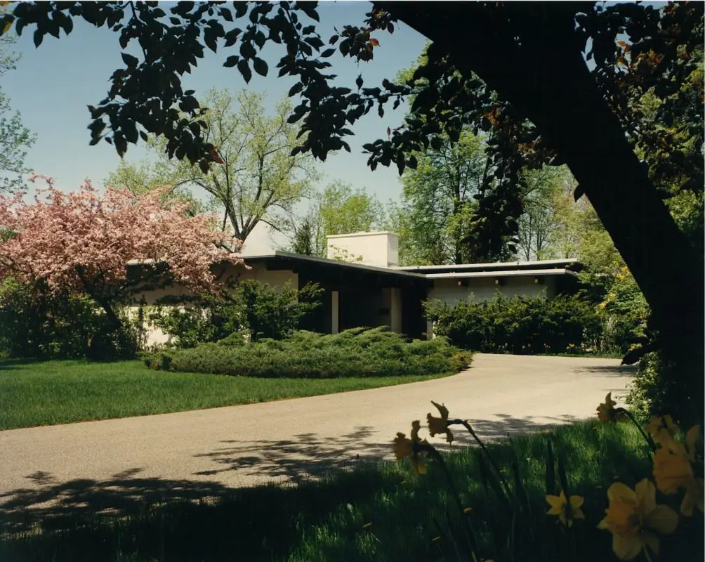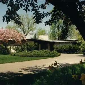 The architect’s drawings for a home for the Gabel family are dated August 22, 1957. The L-shaped concrete block house sits on a wooded lot that slopes down to a creek near the Alden B. Dow Home and Studio on Post Street. A flat roof overhangs the low block walls and is topped by a massive central chimney. Rising slightly above the ell enclosing the main living space is a parallel roof, with a clerestory of plastic panels between the two horizontal rooflines. A two-car garage is attached at a right angle.