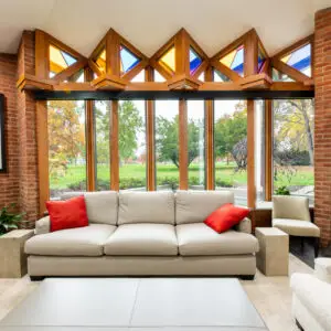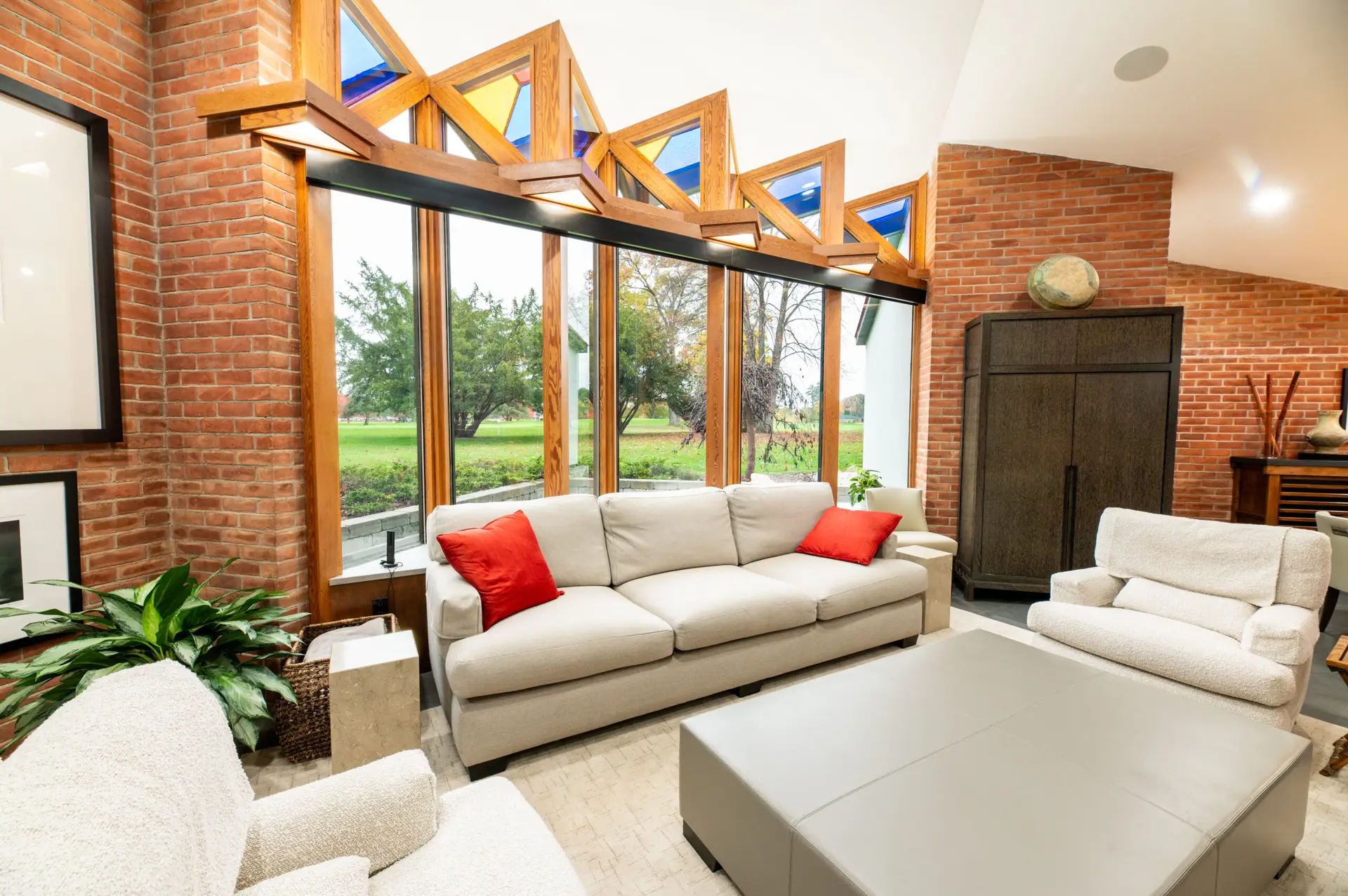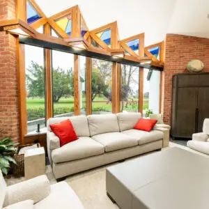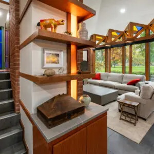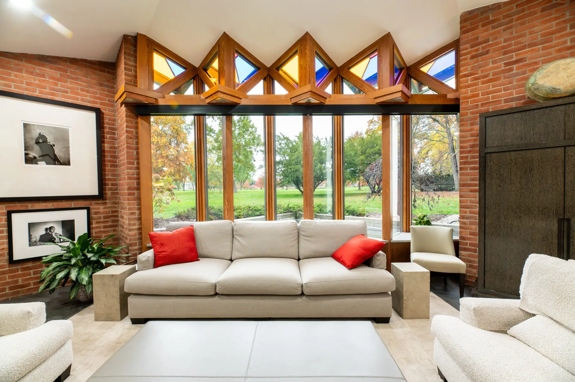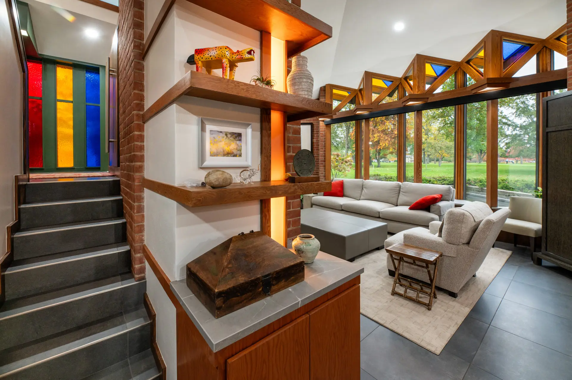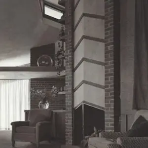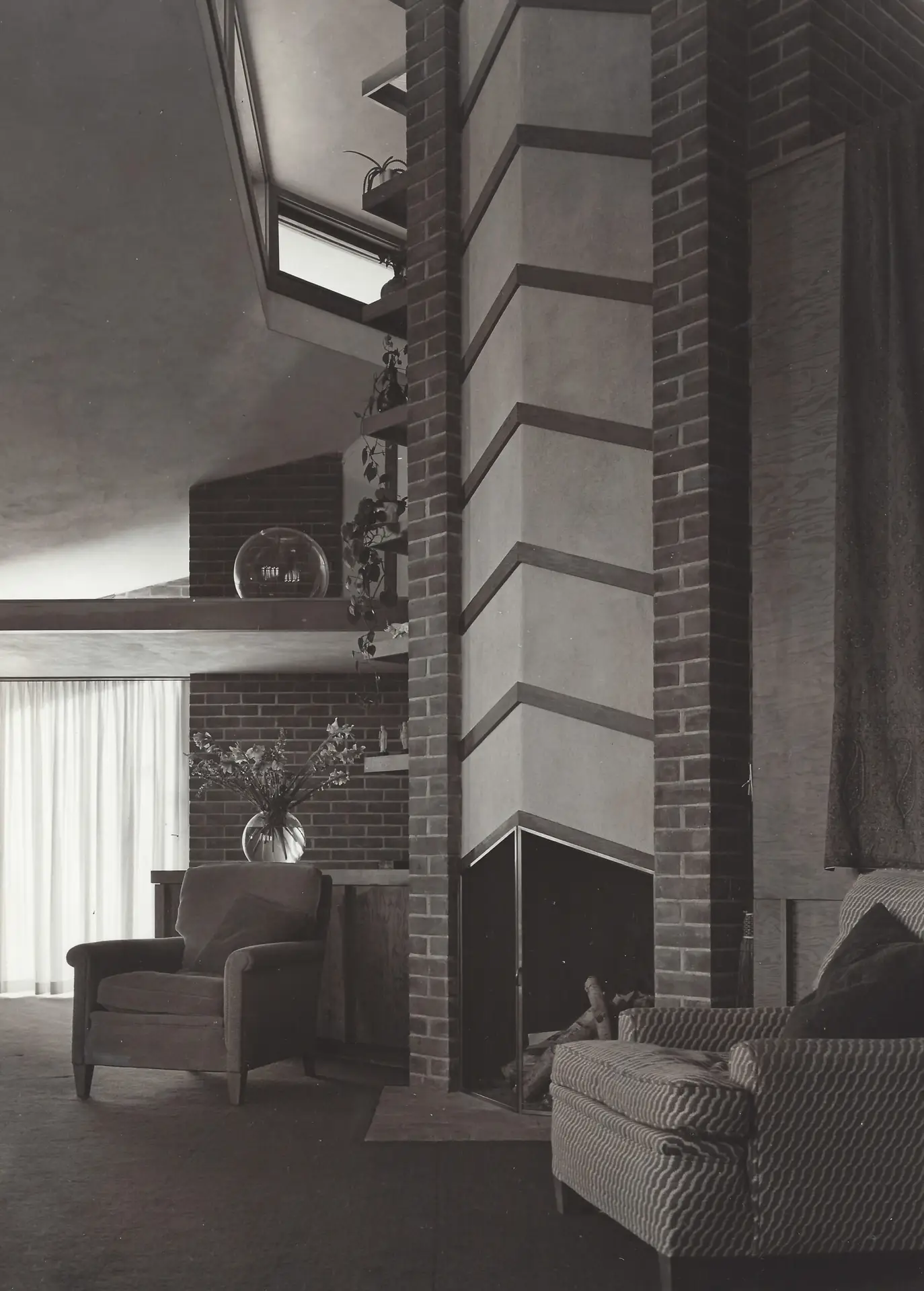 The entrance to the house is at the junction of the rectangular core and the tilted end. While one walks at ground level along the façade, the door opens on a middle level. Steps lead down into the spacious living room revealing a wall of windows placed in a saw tooth pattern. The sharp angles of the windows bend and redirect the light most of the day. Outside the windows is one of two outdoor reflecting pools bringing the interior design and exterior landscaping into close harmony. The saw tooth design is repeated in the wood bands on the chimney breast that point upward to the vaulted ceiling. At the far end of the room, the ceiling drops dramatically to create an inviting dining area with a view of the terrace and second reflecting pool. Also on this level are the kitchen, maid’s quarters, and a large game room.