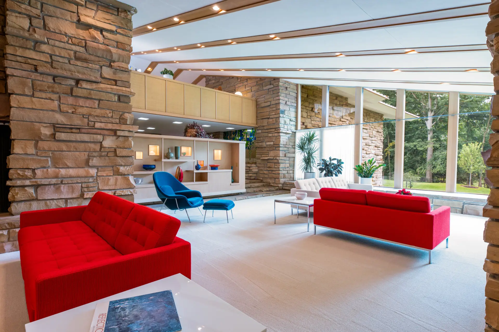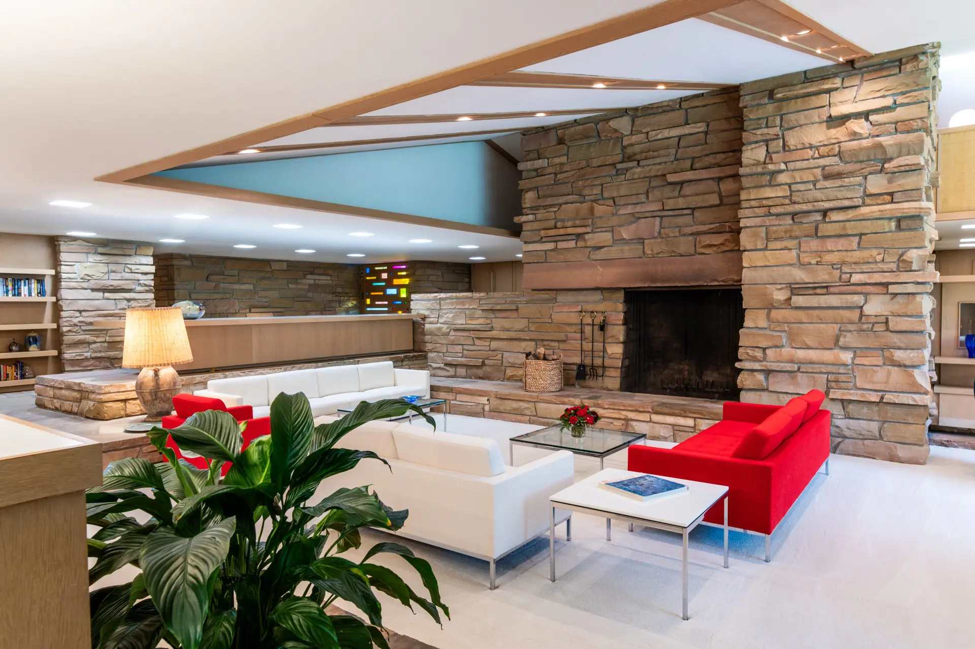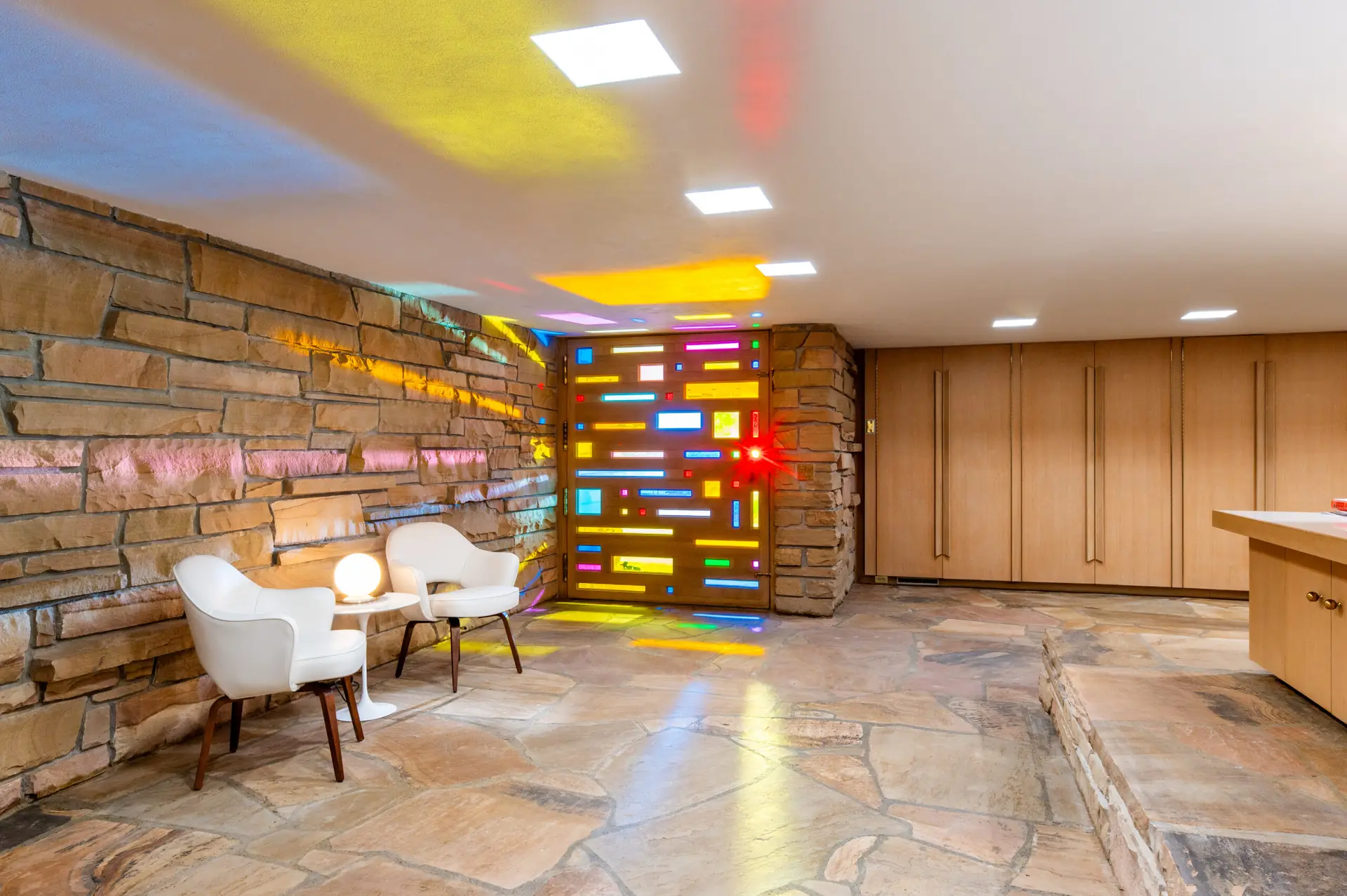 A jeweled entrance door six feet wide offers a sweeping invitation to the house. The jewels are squares and rectangles, dots and dashes of glass in a dozen vibrant hues. The stone floor of the entrance hall reaches out in two directions to form a gallery around the drop-level living room and up broad steps to a family sitting room. Both spaces are dominated by imposing stone fireplaces; the rough-shaped lintel stone over the sitting room hearth weighs more than two tons and creates a stunning focal point. Nearby is a mural of triangular mirrors made by Eugene Masselink, artist and secretary to Frank Lloyd Wright and whom Mr. Dow first met during his time as a Taliesin Fellow in 1933.
