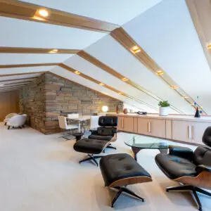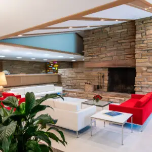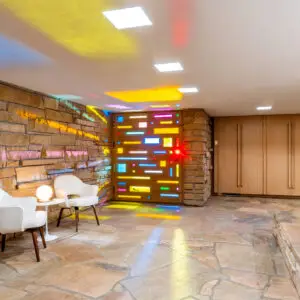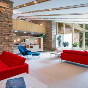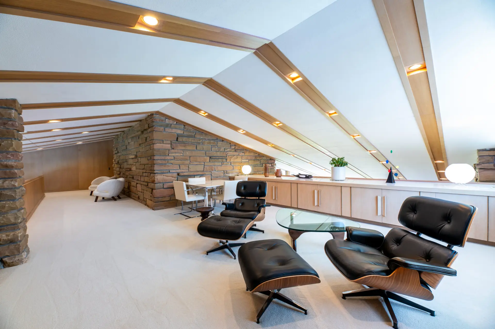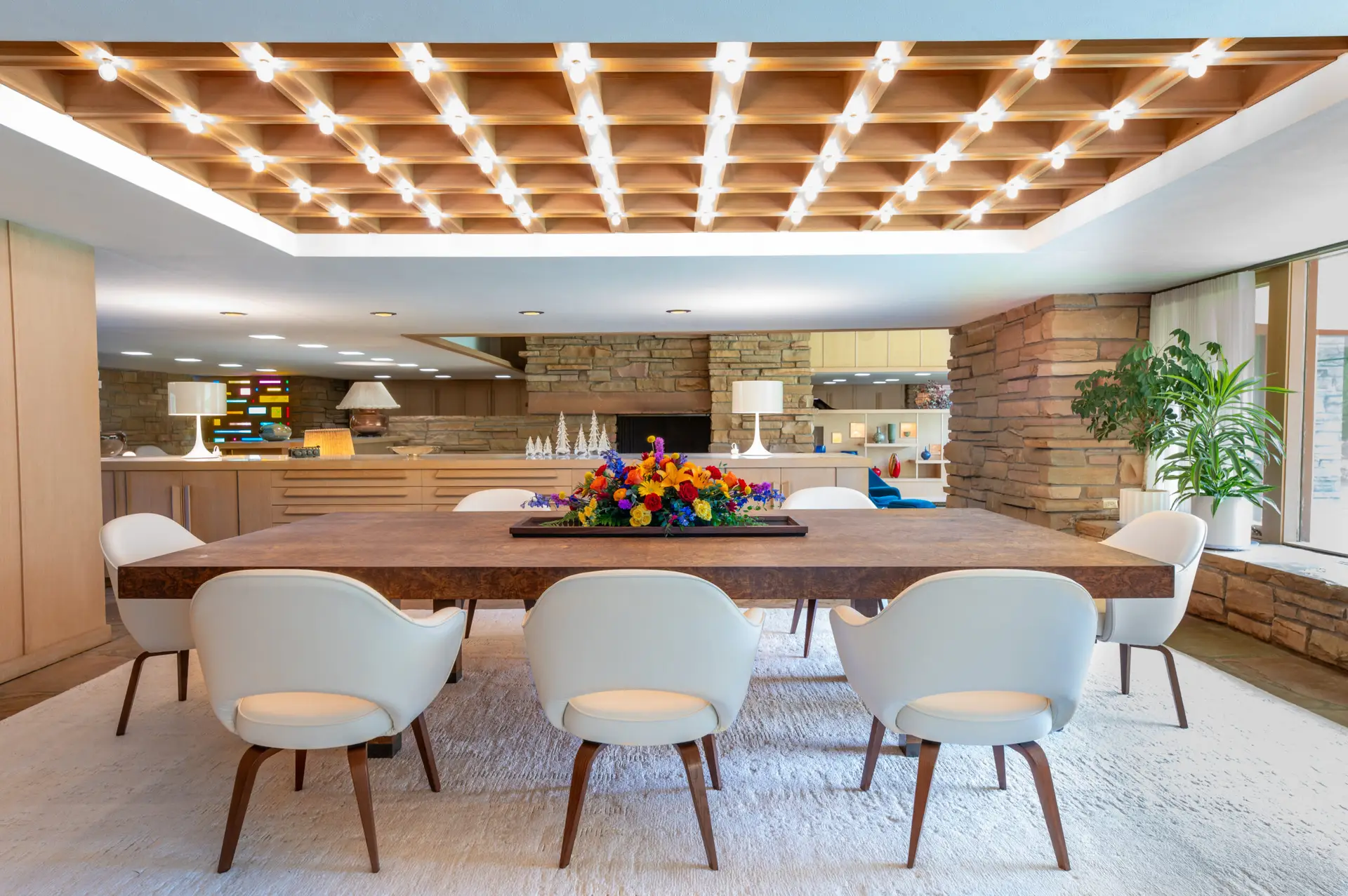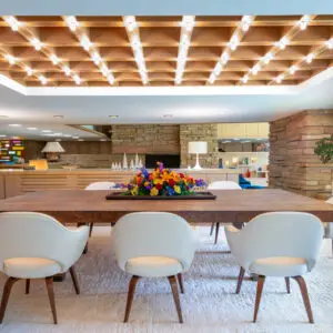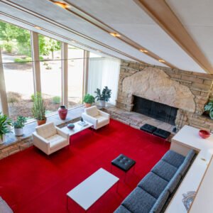 A jeweled entrance door six feet wide offers a sweeping invitation to the house. The jewels are squares and rectangles, dots and dashes of glass in a dozen vibrant hues. The stone floor of the entrance hall reaches out in two directions to form a gallery around the drop-level living room and up broad steps to a family sitting room. Both spaces are dominated by imposing stone fireplaces; the rough-shaped lintel stone over the sitting room hearth weighs more than two tons and creates a stunning focal point. Nearby is a mural of triangular mirrors made by Eugene Masselink, artist and secretary to Frank Lloyd Wright and whom Mr. Dow first met during his time as a Taliesin Fellow in 1933.