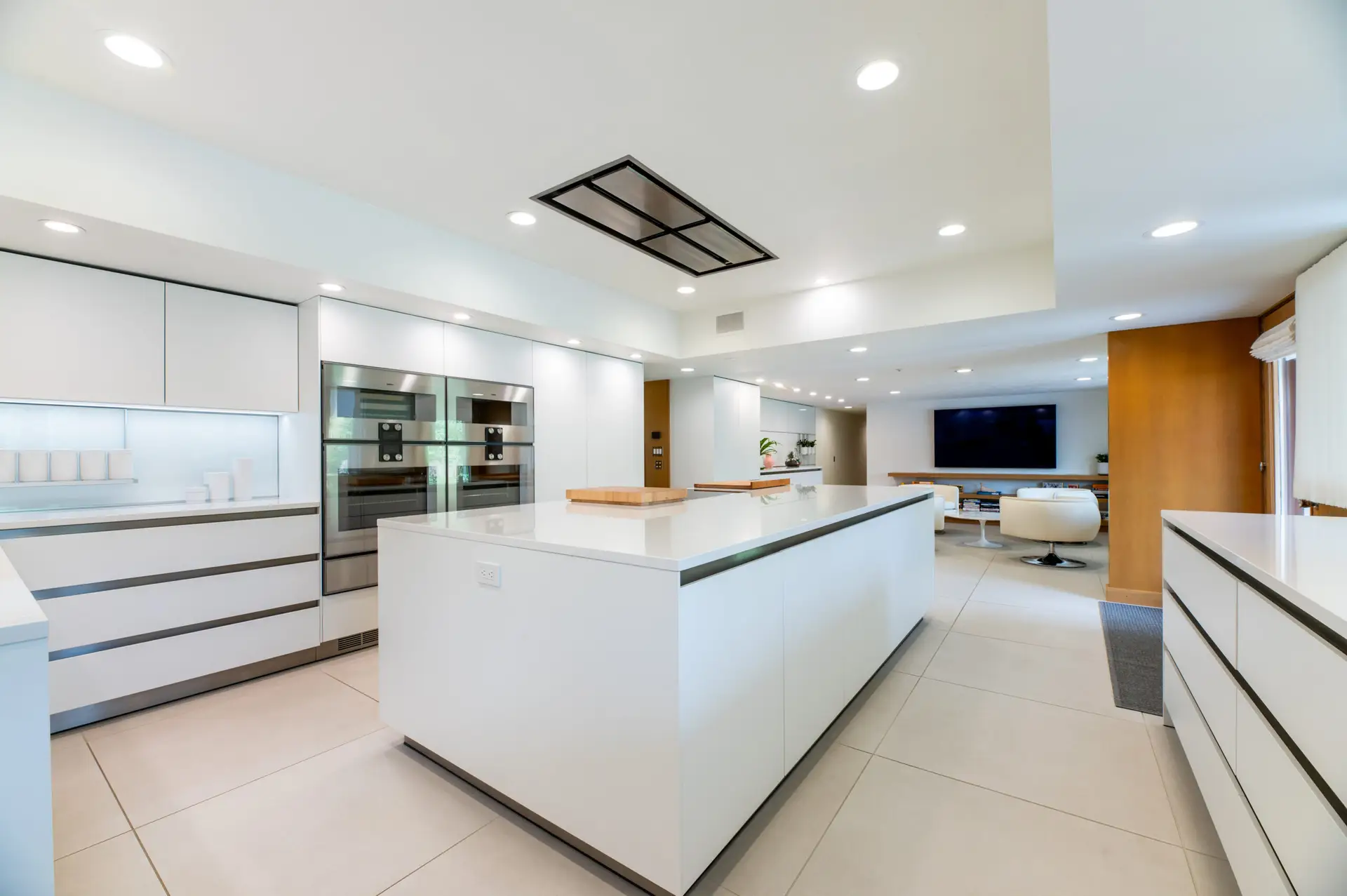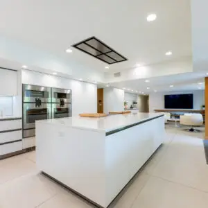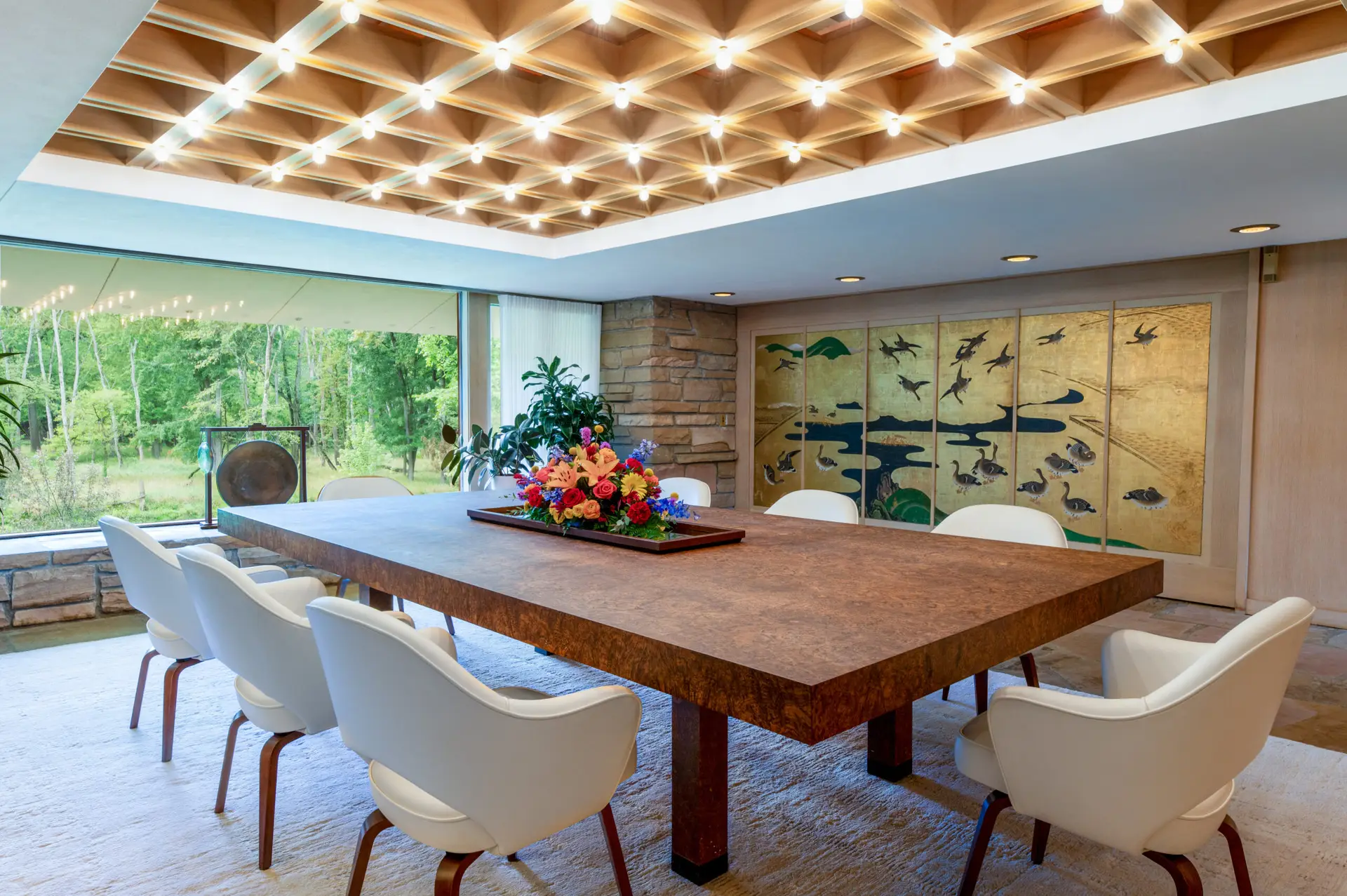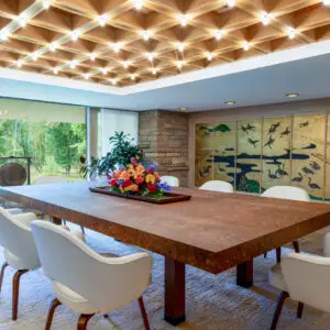 Three steps up from the living room is the dining room with a sparkling canopy of light created by Mr. Dow. A mirror is recessed high in the ceiling, then crisscrossed with heavy beams. Lights like tiny stars dot this grid at regular intervals and are reflected in the mirror. Immediately adjacent to the dining room is a solarium that opens to a large stone terrace. On display in the Archives are the original sketches of various landscape features drawn by Paul Tono, the Japanese landscape architect and life-long friend of the Dow family