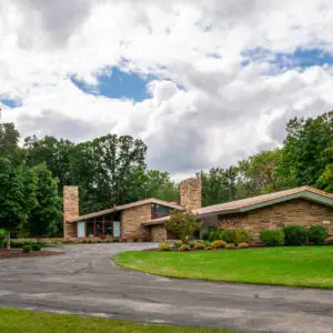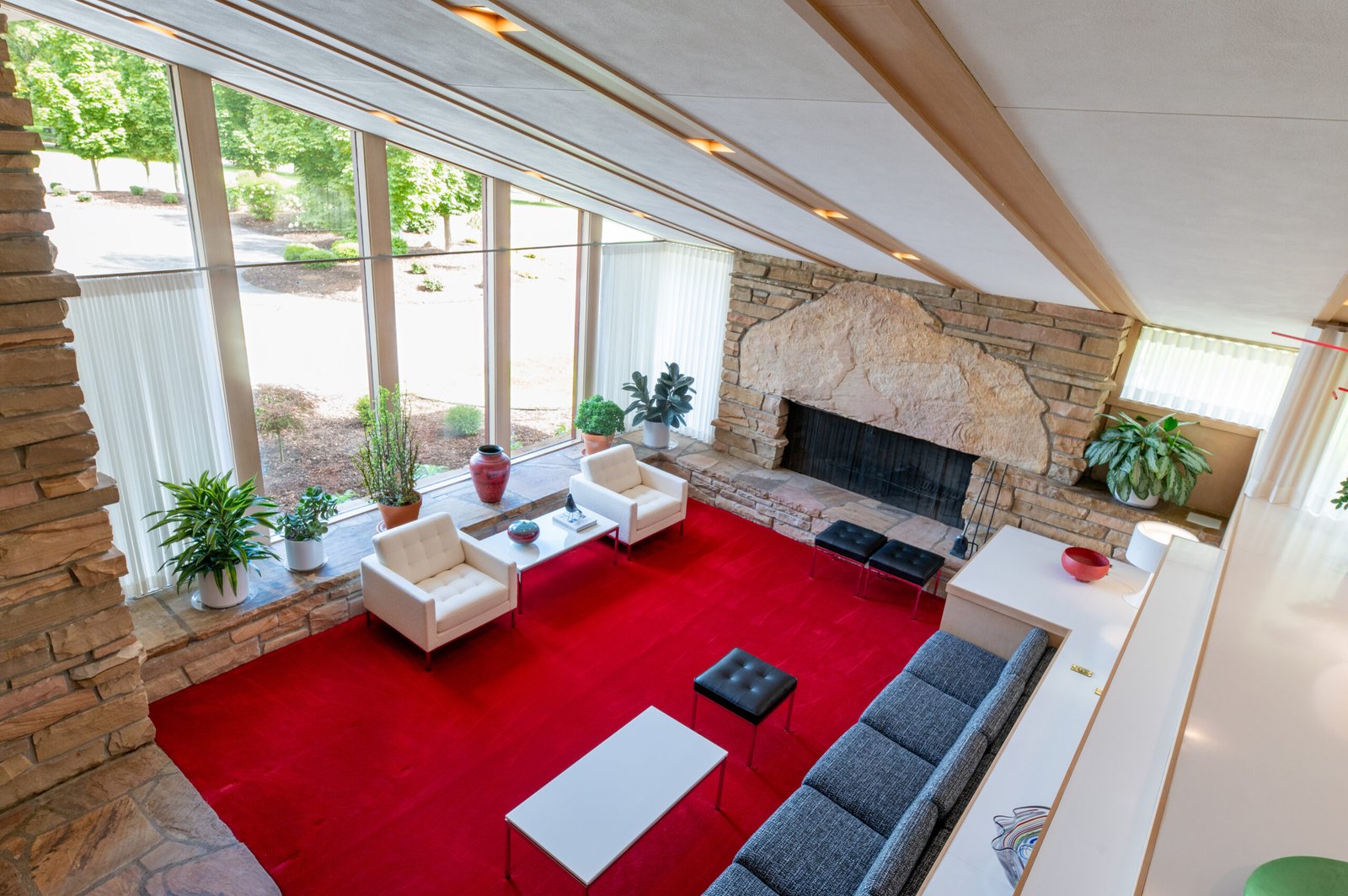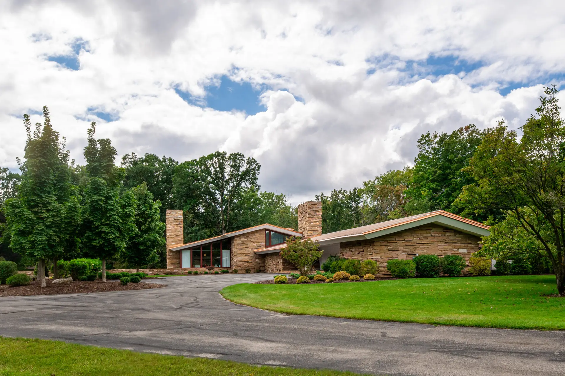 In 1956 the chairman of the Dow Chemical Company, Leland I. Doan, asked Alden B. Dow to design a house for his family, one that would be eminently suited as well for the entertaining expected of one in his position. The result is a residence built of randomly-laid Tennessee quartzite stone that blends naturally with its site and, like nature itself, is on a massive scale. The basic design features two low-sloping shingle roofs on the exterior and three main levels on the interior.