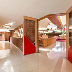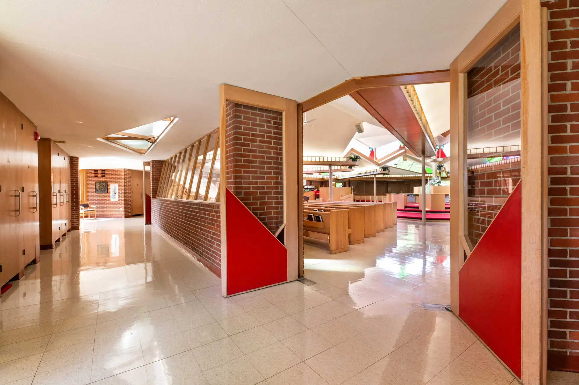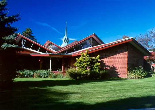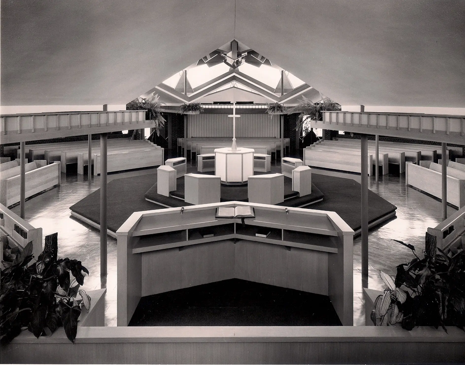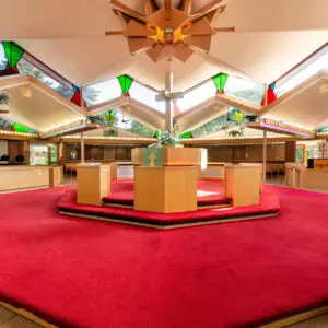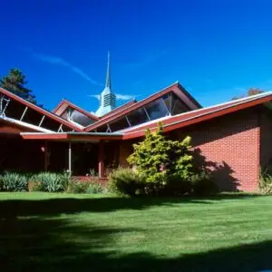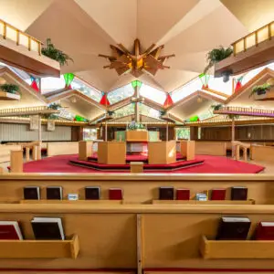 The Church is octagonal in form, with seven banks of pews radiating from the core; the eighth bank contains the choir and the organ. The clerestory windows surrounding the sanctuary bathe it in light and give the congregation an unobstructed view of the open sky. The clerestories are formed by the gabled ends of the radiating wings and contain double membrane fixed windows, some with stained glass. Classrooms, social hall, library, chapel, meeting rooms and offices radiate from the worship space.
