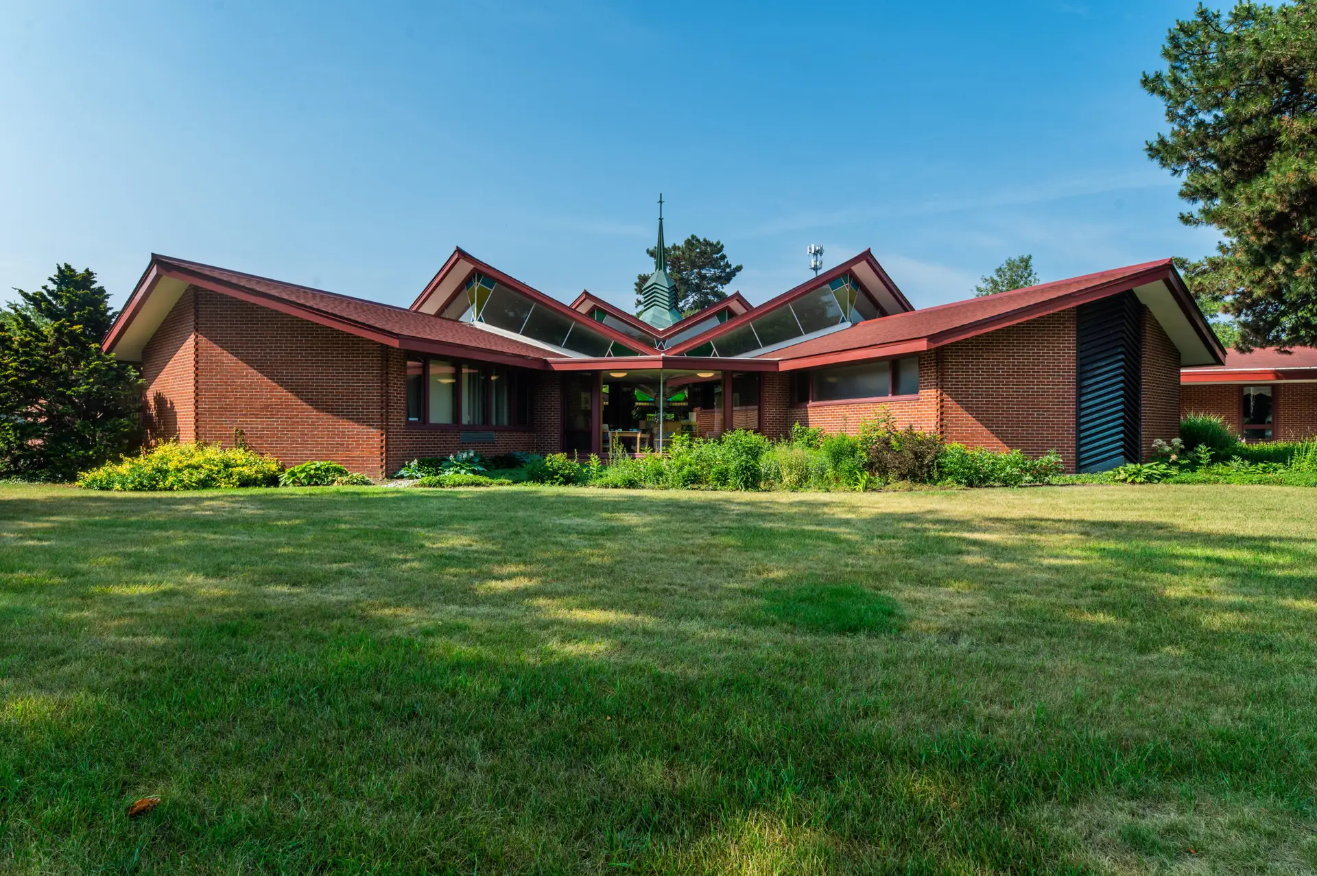From the outside, simple but dominant sight lines merge toward the center of the structure where the stylized copper spire rises directly over the center of the sanctuary. Roof supports are fan-like and radiate 180 degrees from the central point of the steeple, providing some lightness and lift to the structure. Two church wings buttress the octagonal nave and are carefully proportioned and equipped to provide the congregation with a full range of services.