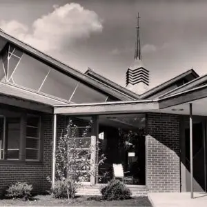 Alden B. Dow regarded St. John’s Lutheran Church on East Carpenter Street in Midland as one of his most significant religious structures. Designed in 1953, the nave of the church accommodates 600 people with no one in the congregation more than 60 feet away from the center of the altar. Mr. Dow believed “the symbol and center of the church is the altar. All the life and activity of the church radiates and develops from this central theme. With humility and enthusiasm, the building is trying to show that growth is unrestricted so long as it radiates from the principle of God.”