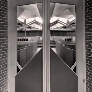 The fixed glasses surrounding the sanctuary are set at an angle to avoid reflections. The doors from the hall are high to make the worshiper sense their relative smallness.