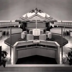 The project began with the concept of a “fortress”. “Dow relied on Martin Luther’s saying ‘Go out and build a fortress.’ Concluding that the fortress should be the people of the church, the architect put them in seats surrounding the altar.”
