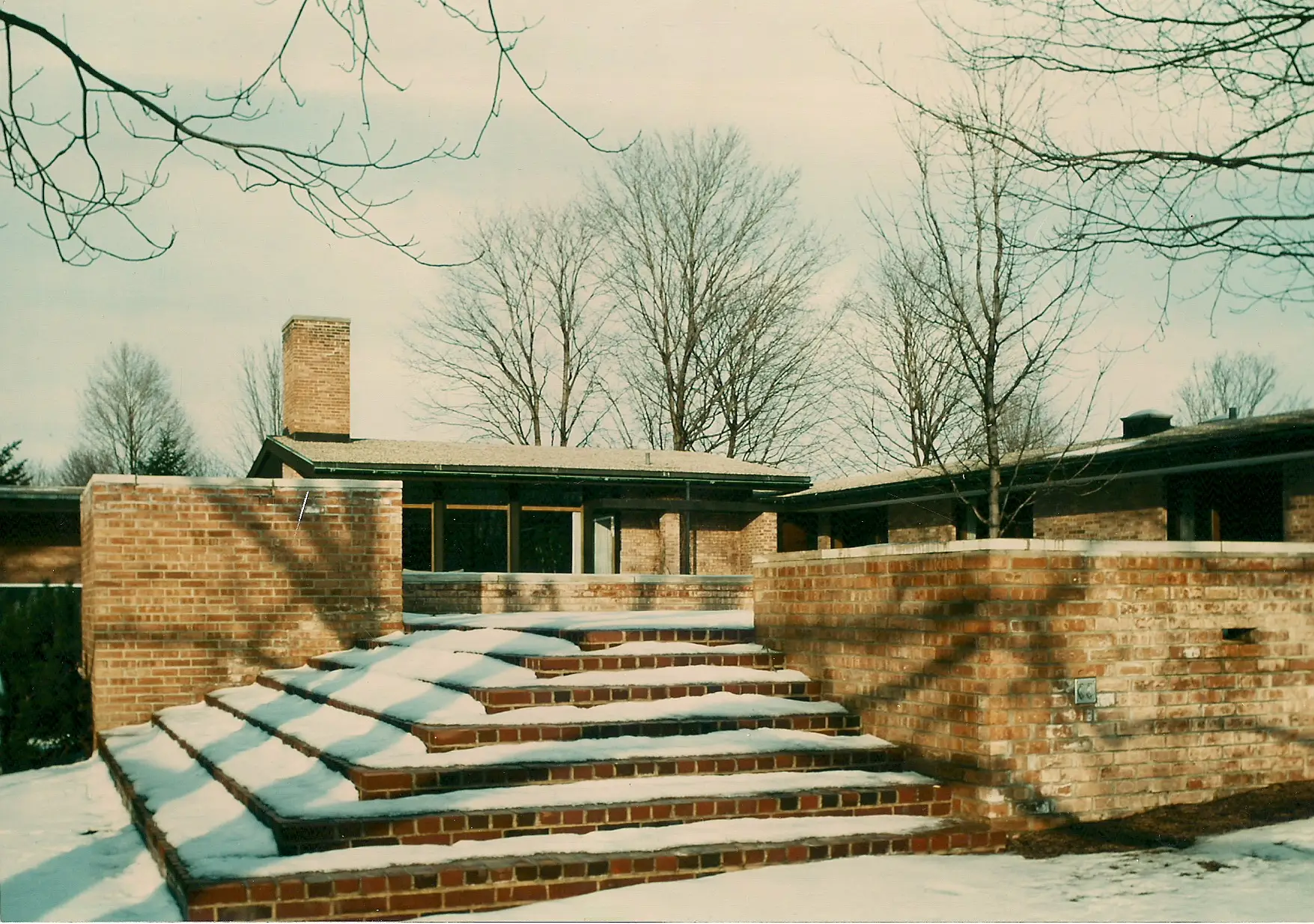 A row of clerestory windows follows the low roof line. On the exterior walls, Chicago Common pink bricks are laid in a horizontal pattern that further accentuates the horizontal lines of the structure. The front door is made up of different pieces of wood collected by the Whitings in their travels throughout the world, including Brazilian Cedar, New Zealand Red Pine, and Rosewood from Thailand. A work of art, the door was specially designed for them by Mr. Dow and constructed in the workshop of the architectural studio by Ted Gwizdala, his master woodworker.