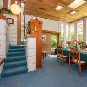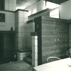 The interior color scheme was prescribed by Mr. Dow. Carpeting throughout the dining and living areas was turquoise and draperies were red with blue. The built-in seat by the living room hearth was covered in striped material combining all the colors of the room. Mustard color linoleum was in the game room, kitchen and maid’s room. In the owner’s bathroom, the specifications called for peach color walls and green fixtures; in the hall bath, the walls were tan and the fixtures lavender.