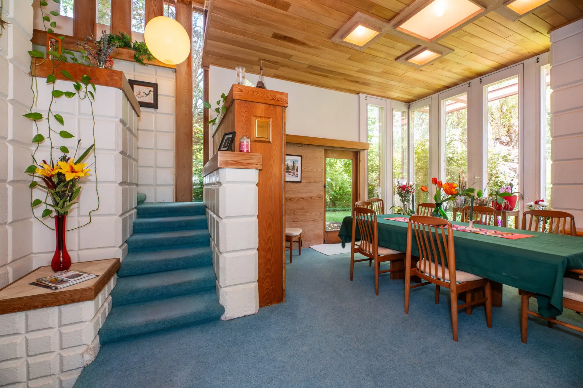 The Whitman Residence beautifully illustrates Mr. Dow’s expertise in merging structure with site. At first the house appears to be one story, submerged into the landscape. The building’s relatively simple exterior of continuous horizontal layering, however, encloses an interior of five levels.